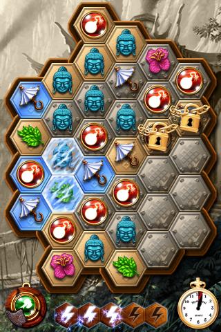 Helping you out occasionally are talisman powers that can change or flip tiles. Clearing four or more talisman symbols from the screen activates the related power such as the hammer that hits tiles, causing them to switchcolours. Others trigger explosions and flip tiles in a straight line.