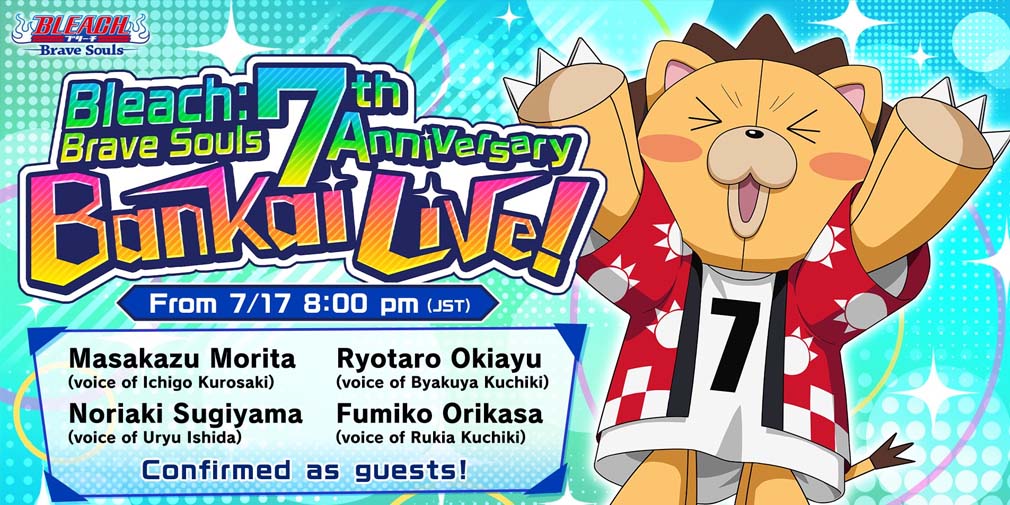 In Bleach: Brave Souls' 7th Anniversary Bankai Live, players can look forward to the announcement of the "Who would you spend summer with?" campaign's top three swimsuit characters. With Yoshiyuki Hirai from America Zarigani as host, the broadcast will highlight Masakazu Morita (voice of Ichigo Kurosaki), Ryotaro Okiayu (voice of Byakuya Kuchiki), Noriaki Sugiyama (voice of Uryu Ishida) and Fumiko Orikasa (voice of Rukia Kuchiki).