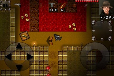 You control an Indiana Jones wannabe who's been cast out for pursuing radical experiments and is now pursuing the secret of immortality. Using two virtual analogue sticks to move and shoot, you traipse through top-down levels in the hopes of becoming a god.