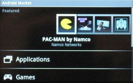 First things first. To get onto the Android Market, just tap the little green Market icon on your phone, which will take you to this home page, which shows some featured apps and the section categories.