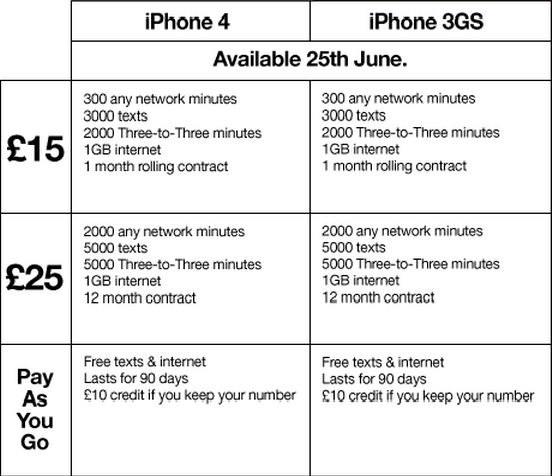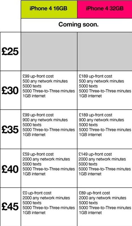 3 Mobile's confidence appears to be justified. To take a single tariff as a point of comparison, a 16GB iPhone 4 on 3 with 500 any network minutes, 5000 3-to-3 minutes, and 1GB of data will cost you £99 for the handset and £30 a month. (3 hasn't revealed anything on contract duration, but we can assume all contracts are 24 months for now.)