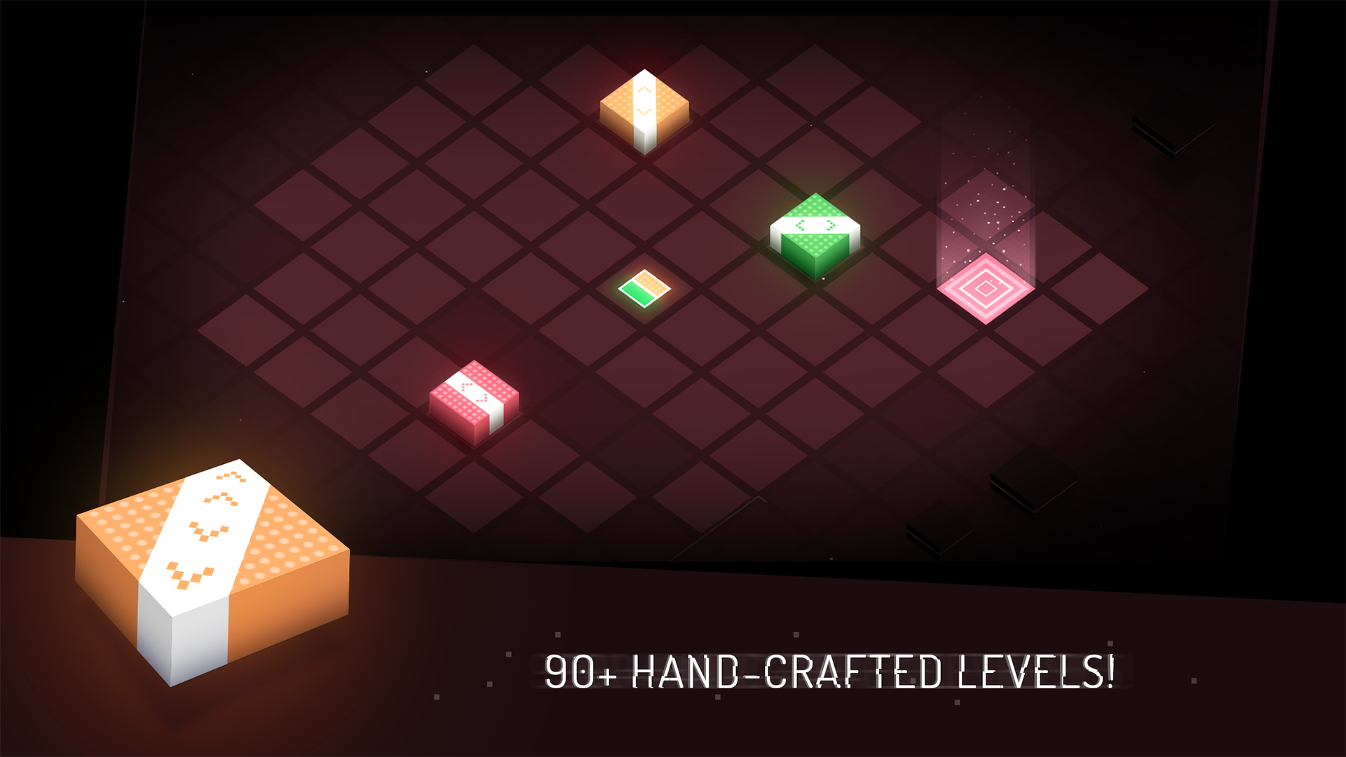 You have four blocks that must guided to the exit, and each is wrapped almost like a present. One moves horizontally, another vertically, and two going in opposing diagonal directions. They’re colourful, and a stripe (which almost looks like a ribbon, hence the present comparison) indicates which direction the blocks can move. Once they’re on the same square, they stack.